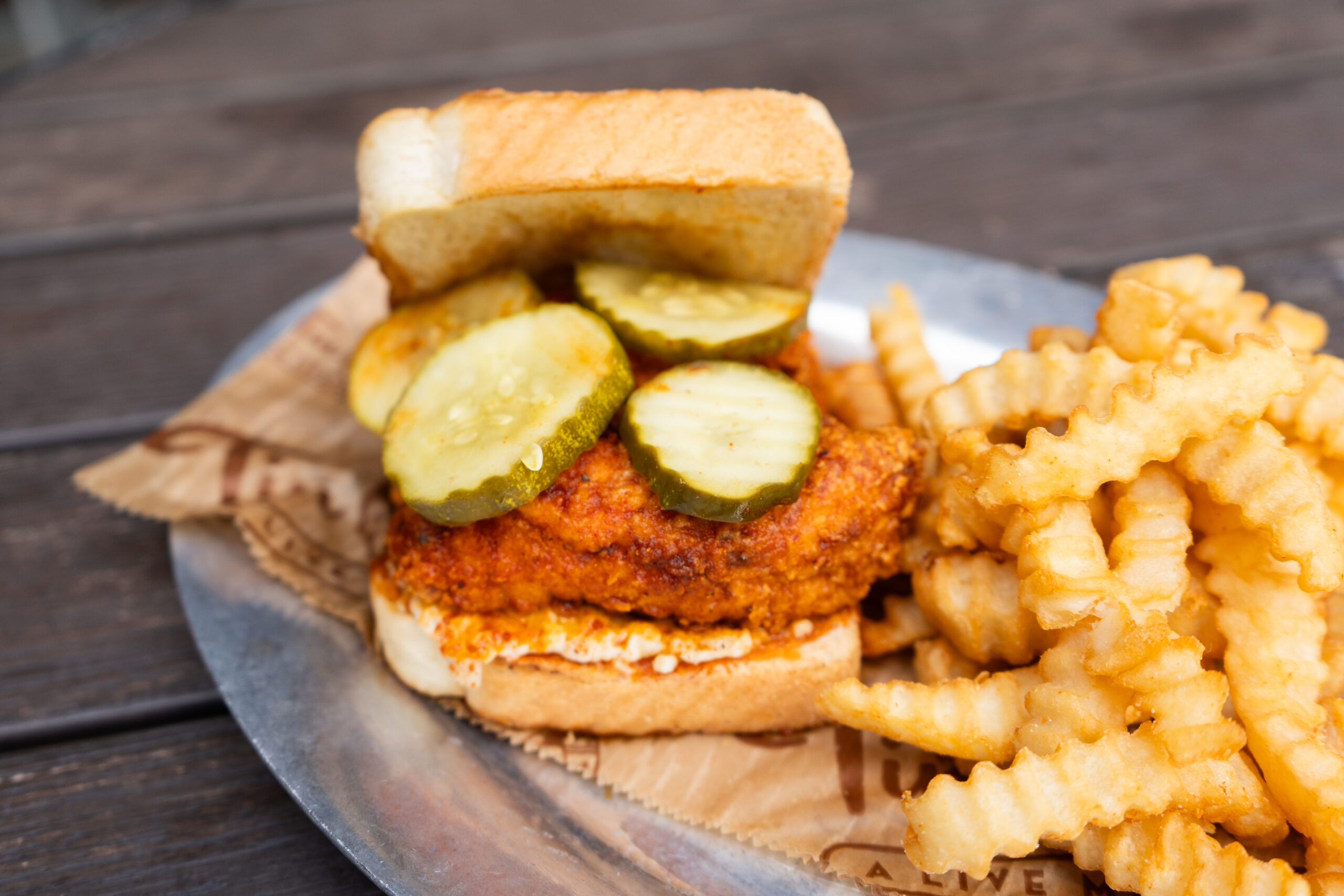 Nashville Hot Chicken Sandwich – Buttermilk fried chicken, rubbed with cayenne, served on Texas Toast with ranch potato salad and pickles